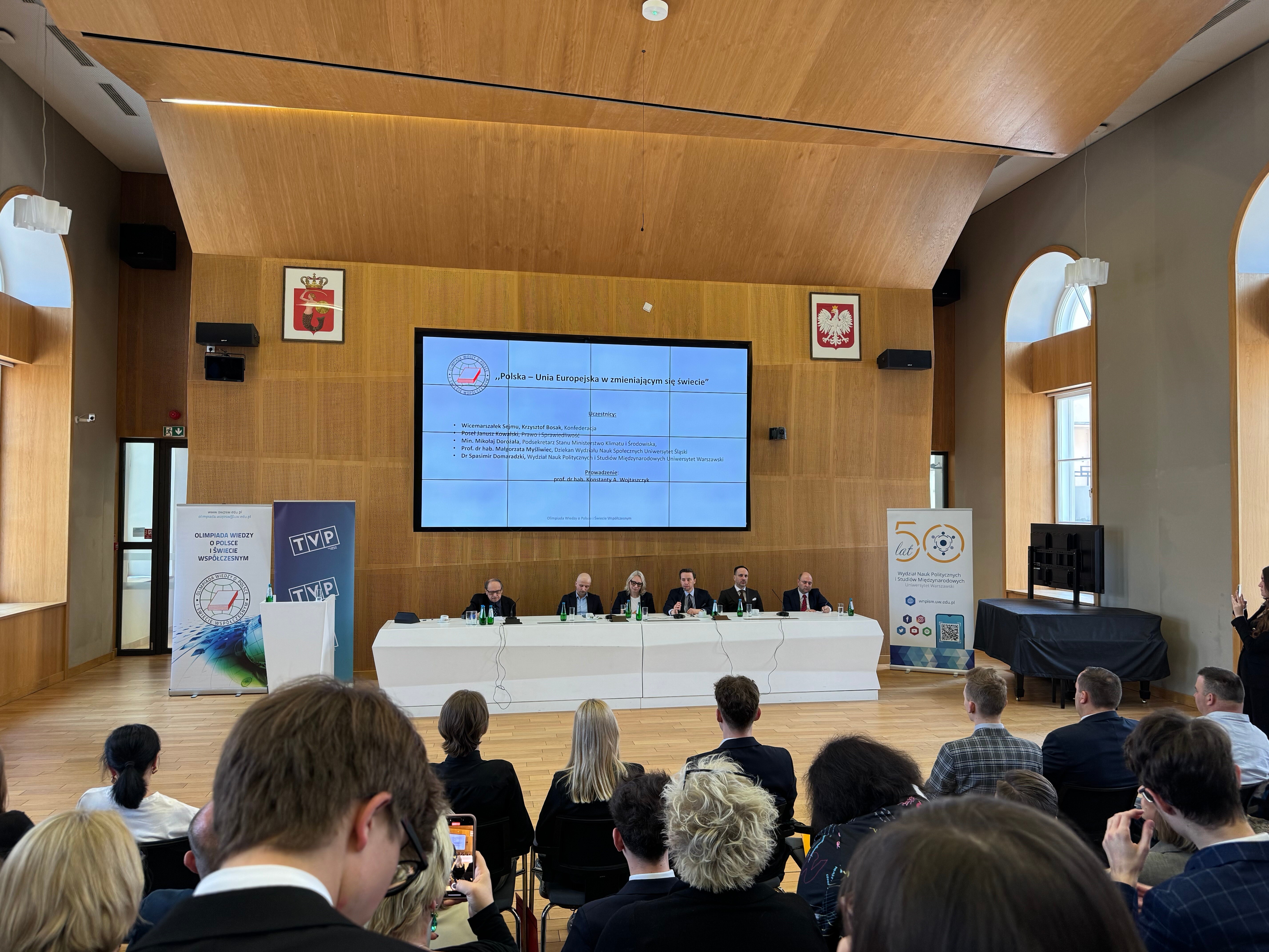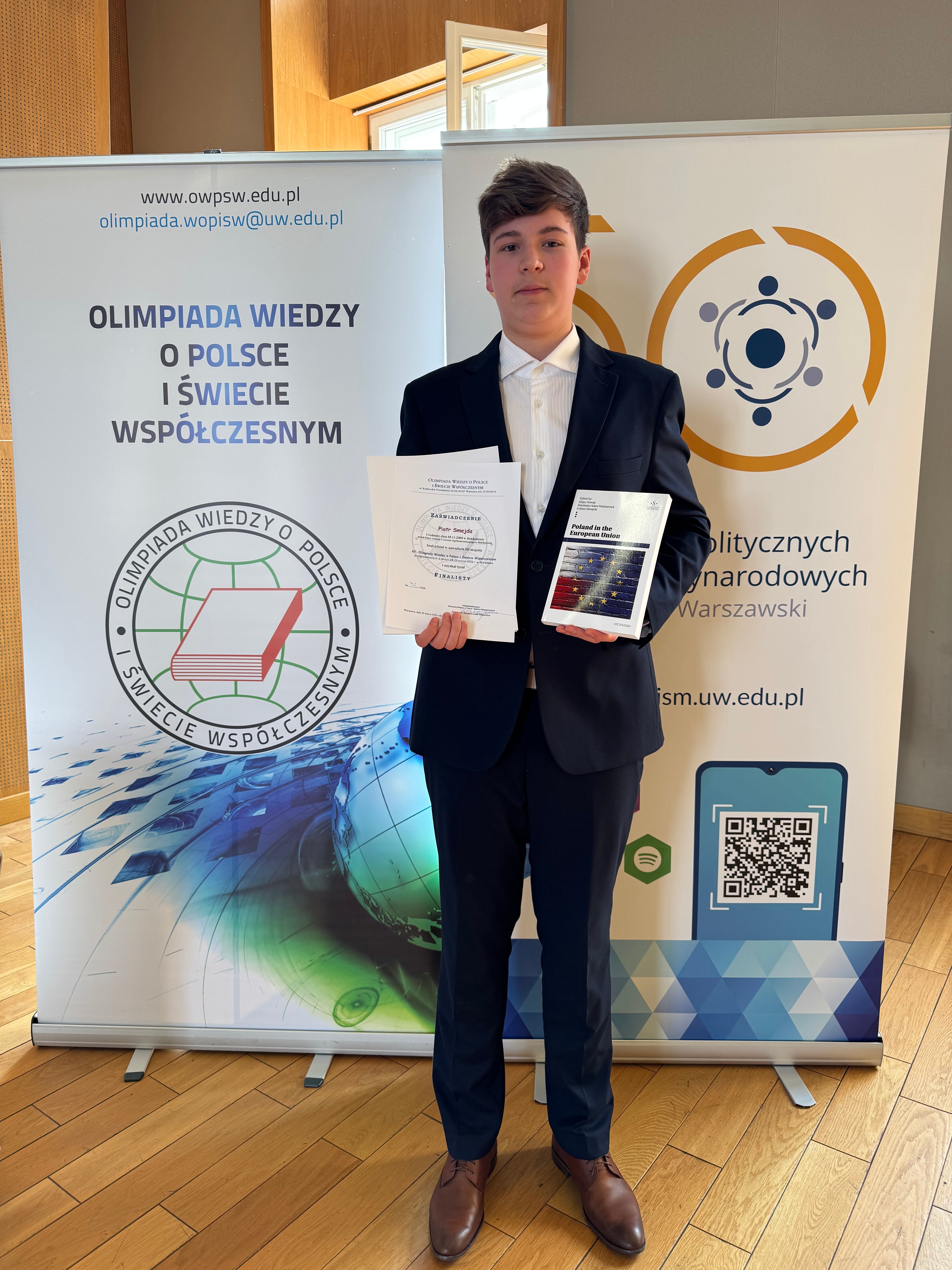 W dniach 28-29.03.2026 r. na Wydziale Nauk Politycznych i Studiów Międzynarodowych Uniwersytetu Warszawskiego odbyły się zawody centralne (III etap) 67. Olimpiady Wiedzy o Polsce i Świecie Współczesnym. Jest to jedna z najbardziej prestiżowych olimpiad dla uczniów szkół średnich w Polsce. Uczestnicy zmierzyli się z pytaniami dotyczącymi ustrojów państw, stosunków międzynarodowych, społeczeństwa, polityki oraz współczesnej historii. W tych zmaganiach nasz uczeń - Piotr Smejda z klasy 3F uzyskał tytuł finalisty, co zapewniło mu wynik 100% z matury rozszerzonej z wiedzy o społeczeństwie i zdecydowanie ułatwiło drogę na wymarzone studia. Podczas zawodów centralnych odbyły się także wydarzenia dodatkowe, takie jak zwiedzanie Pałacu Prezydenckiego, międzypartyjna debata czy występy artystyczne. Serdecznie gratulujemy Piotrowi tego wielkiego sukcesu!